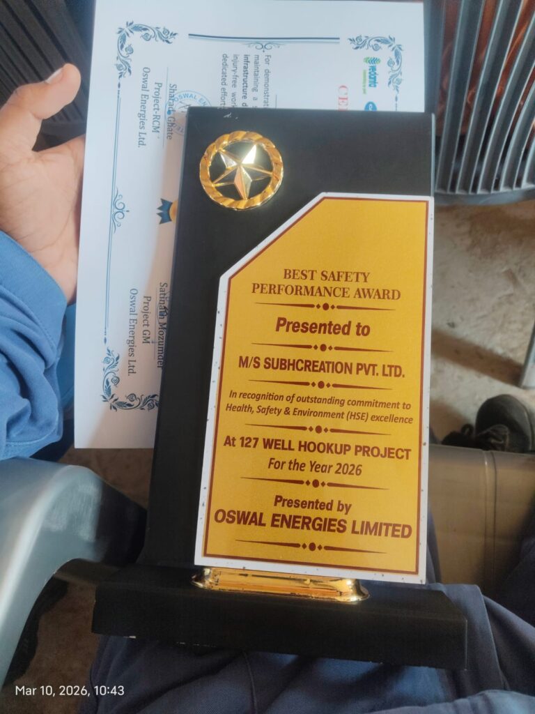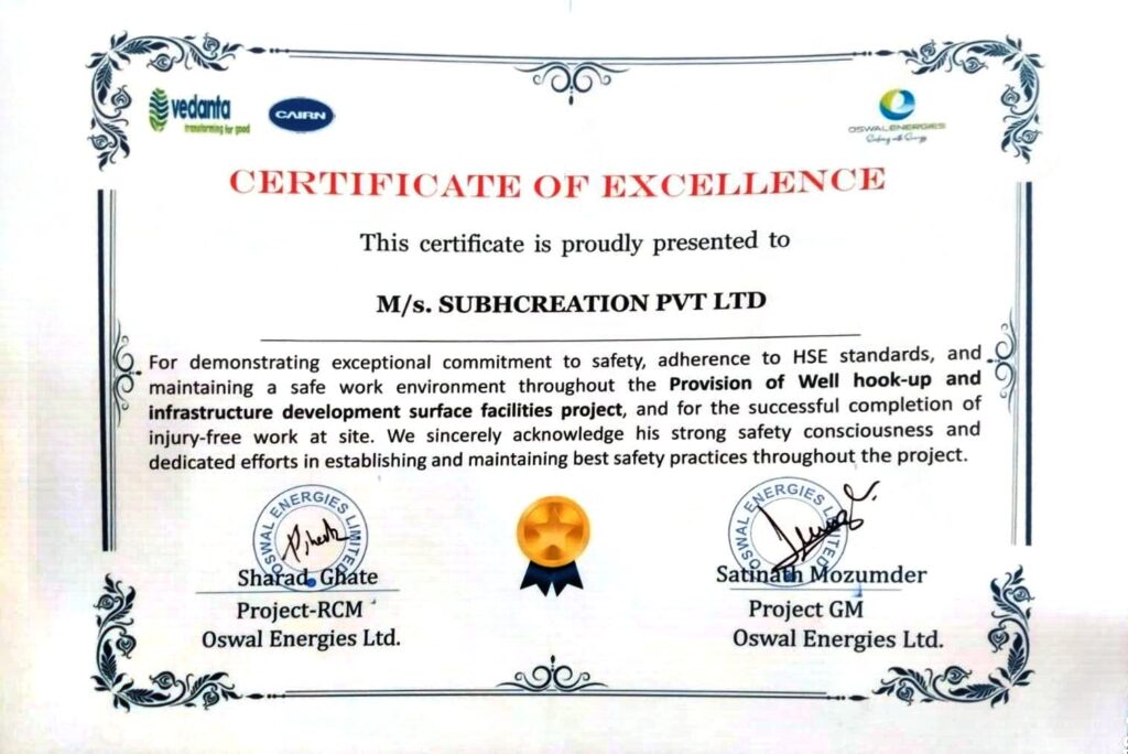 Subhcreation Pvt. Ltd. has been awarded a Certificate of Excellence by Oswal Energies Ltd. in association with Vedanta Limited and Cairn Oil & Gas for demonstrating outstanding commitment to safety and adherence to HSE standards.